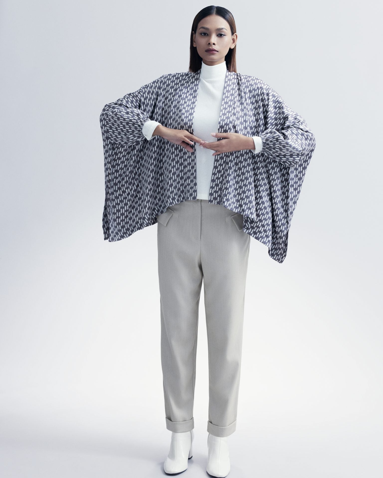 - Centre front button and zip closure